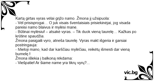 - Vėl prisisprogai… O juk visais šventaisiais prisiekinėjai, jog visada pareisi namo blaivus ir mylėsi mane.