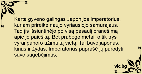 Kartą gyveno galingas Japonijos imperatorius, kuriam prireikė naujo vyriausiojo samurajaus. Tad jis išsiuntinėjo po visą pasaulį pranešimą apie jo paiešką. Bet prabėgo metai, o tik trys vyrai panoro užimti tą vietą. Tai buvo japonas, kinas ir žydas. Imperatorius paprašė jų parodyti savo sugebėjimus.