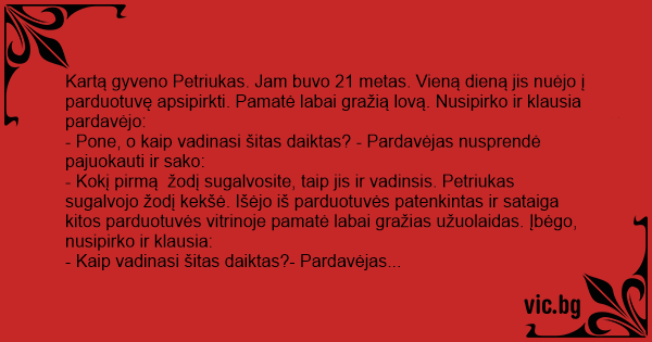 Kartą gyveno Petriukas. Jam buvo 21 metas. Vieną dieną jis nuėjo į parduotuvę apsipirkti. Pamatė labai gražią lovą. Nusipirko ir klausia pardavėjo: