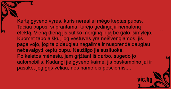 Atsiprašinėdama, kad užtruko, žmona paklausė jo, ar šis slapta nebuvo nusiėmęs raiščio. Jis užtikrino ją, kad nė nežvilgtelėjo. Tuomet ji nurišo jam raištį ir sušuko: „Staigmena!!!“.