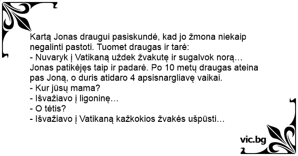 Jonas patikėjęs taip ir padarė. Po 10 metų draugas ateina pas Joną, o duris atidaro 4 apsisnargliavę vaikai.
