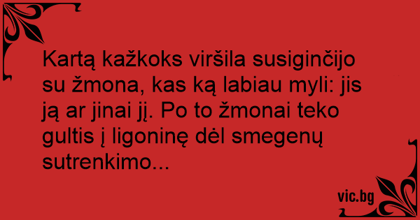 Kartą kažkoks viršila susiginčijo su žmona, kas ką labiau myli: jis ją ar jinai jį. Po to žmonai teko gultis į ligoninę dėl smegenų sutrenkimo...