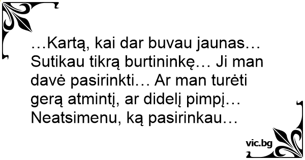 …Kartą, kai dar buvau jaunas… Sutikau tikrą burtininkę… Ji man davė pasirinkti… Ar man turėti gerą atmintį, ar didelį pimpį… Neatsimenu, ką pasirinkau…