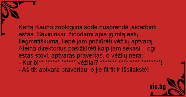 Kartą Kauno zoologijos sode nusprendė įsidarbinti estas. Savininkai, žinodami apie įgimtą estų flegmatiškumą, liepė jam prižiūrėti vėžlių aptvarą. Ateina direktorius pasižiūrėti kaip jam sekasi – ogi estas stovi, aptvaras pravertas, o vėžlių nėra: