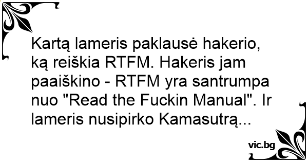 Kartą lameris paklausė hakerio, ką reiškia RTFM. Hakeris jam paaiškino - RTFM yra santrumpa nuo "Read the Fuскin Manual". Ir lameris nusipirko Kamasutrą...