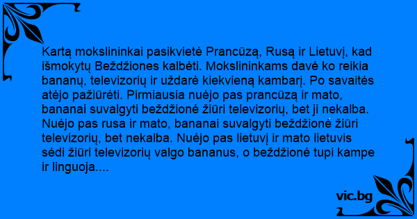 Kartą mokslininkai pasikvietė Prancūzą, Rusą ir Lietuvį, kad išmokytų Beždžiones kalbėti. Mokslininkams davė ko reikia bananų, televizorių ir uždarė kiekvieną kambarį. Po savaitės atėjo pažiūrėti. Pirmiausia nuėjo pas prancūzą ir mato, bananai suvalgyti beždžionė žiūri televizorių, bet ji nekalba. Nuėjo pas rusa ir mato, bananai suvalgyti beždžionė žiūri televizorių, bet nekalba. Nuėjo pas lietuvį ir mato lietuvis sėdi žiūri televizorių valgo bananus, o beždžionė tupi kampe ir linguoja. Mokslininkai ir sako: