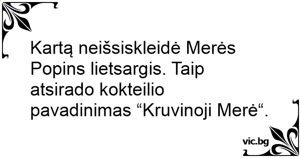 Kartą neišsiskleidė Merės Popins lietsargis. Taip atsirado kokteilio pavadinimas “Kruvinoji Merė“.