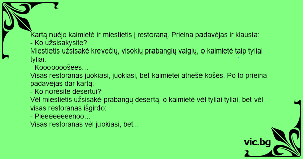 Visas restoranas juokiasi, juokiasi, bet kaimietei atnešė košės. Po to prieina padavėjas dar kartą: