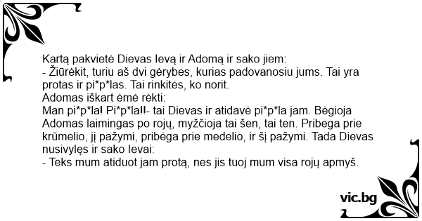 Man pi*p*la! Pi*p*la!!- tai Dievas ir atidavė pi*p*la jam. Bėgioja Adomas laimingas po rojų, myžčioja tai šen, tai ten. Pribega prie krūmelio, jį pažymi, pribėga prie medelio, ir šį pažymi. Tada Dievas nusivylęs ir sako Ievai: