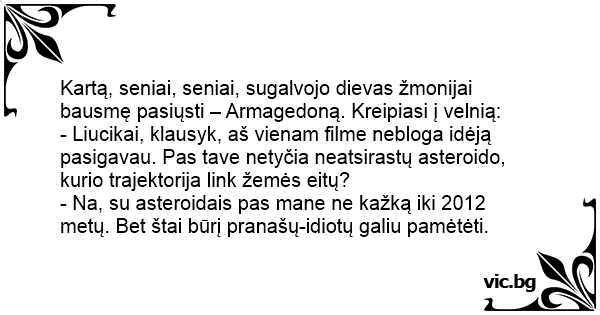 - Na, su asteroidais pas mane ne kažką iki 2012 metų. Bet štai būrį pranašų-idiotų galiu pamėtėti.