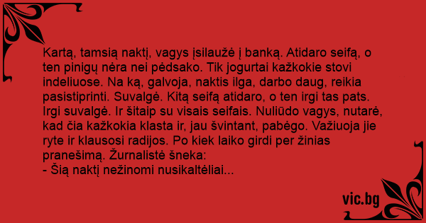 Kartą, tamsią naktį, vagys įsilaužė į banką. Atidaro seifą, o ten pinigų nėra nei pėdsako. Tik jogurtai kažkokie stovi indeliuose. Na ką, galvoja, naktis ilga, darbo daug, reikia pasistiprinti. Suvalgė. Kitą seifą atidaro, o ten irgi tas pats. Irgi suvalgė. Ir šitaip su visais seifais. Nuliūdo vagys, nutarė, kad čia kažkokia klasta ir, jau švintant, pabėgo. Važiuoja jie ryte ir klausosi radijos. Po kiek laiko girdi per žinias pranešimą. Žurnalistė šneka: