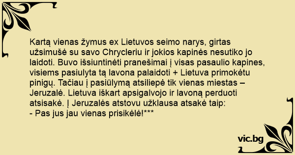 Kartą vienas žymus ex Lietuvos seimo narys, girtas užsimušė su savo Chrycleriu ir jokios kapinės nesutiko jo laidoti. Buvo išsiuntinėti pranešimai į visas pasaulio kapines, visiems pasiulyta tą lavona palaidoti + Lietuva primokėtu pinigų. Tačiau į pasiūlymą atsiliepė tik vienas miestas – Jeruzalė. Lietuva iškart apsigalvojo ir lavoną perduoti atsisakė. Į Jeruzalės atstovu užklausa atsakė taip: