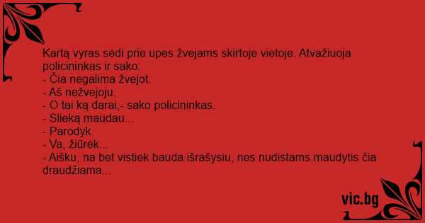 Kartą vyras sėdi prie upes žvejams skirtoje vietoje. Atvažiuoja policininkas ir sako: