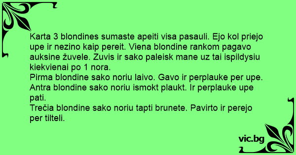 Karta 3 blondines sumaste apeiti visa pasauli. Ejo kol priejo upe ir nezino kaip pereit. Viena blondine rankom pagavo auksine žuvele. Zuvis ir sako paleisk mane uz tai ispildysiu kiekvienai po 1 nora.