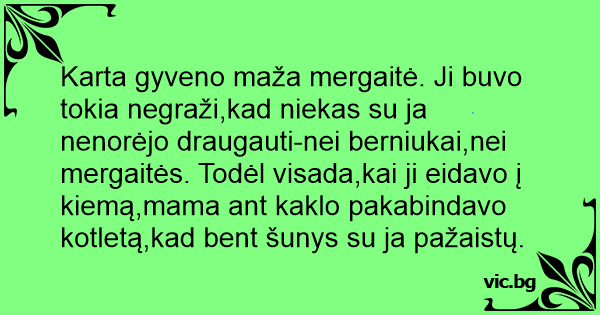 Karta gyveno maža mergaitė. Ji buvo tokia negraži,kad niekas su ja nenorėjo draugauti-nei berniukai,nei mergaitės. Todėl visada,kai ji eidavo į kiemą,mama ant kaklo pakabindavo kotletą,kad веnт šunys su ja pažaistų.