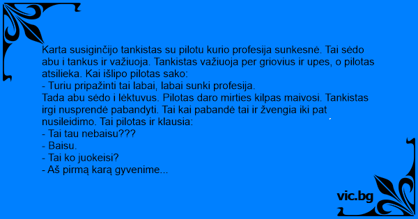 Karta susiginčijo tankistas su pilotu kurio profesija sunkesnė. Tai sėdo abu i tankus ir važiuoja. Tankistas važiuoja per griovius ir upes, o pilotas atsilieka. Kai išlipo pilotas sako: