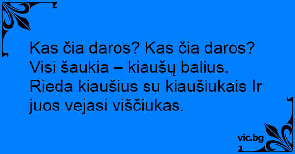 Kas čia daros? Kas čia daros? Visi šaukia – kiaušų balius. Rieda kiaušius su kiaušiukais Ir juos vejasi viščiukas.