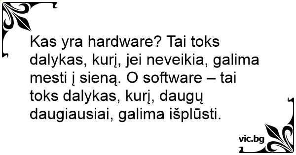 Kas yra hardware? Tai toks dalykas, kurį, jei neveikia, galima mesti į sieną. O software – tai toks dalykas, kurį, daugų daugiausiai, galima išplūsti.