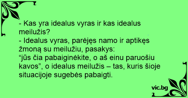 - Idealus vyras, parėjęs namo ir aptikęs žmoną su meilužiu, pasakys: