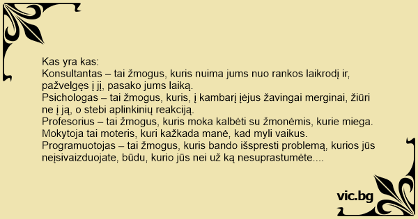 Konsultantas – tai žmogus, kuris nuima jums nuo rankos laikrodį ir, pažvelgęs į jį, pasako jums laiką.