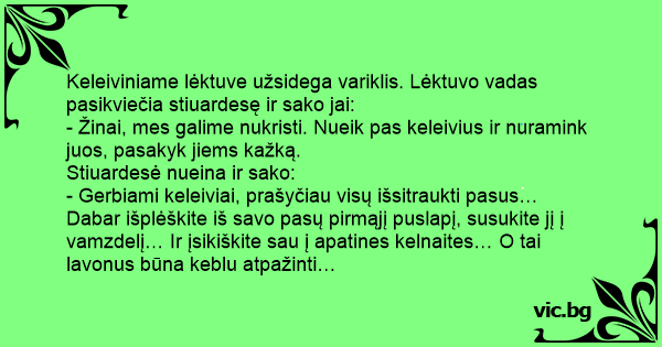 Keleiviniame lėktuve užsidega variklis. Lėktuvo vadas pasikviečia stiuardesę ir sako jai: