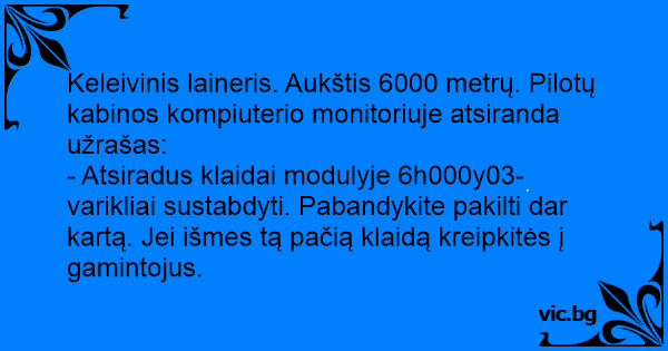 Keleivinis laineris. Aukštis 6000 metrų. Pilotų kabinos kompiuterio monitoriuje atsiranda užrašas: