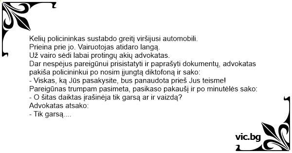 Dar nespėjus pareigūnui prisistatyti ir paprašyti dokumentų, advokatas pakiša policininkui po nosim įjungtą diktofoną ir sako: