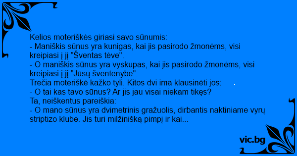 - O mano sūnus yra dvimetrinis gražuolis, dirbantis naktiniame vyrų striptizo klube. Jis turi milžinišką pimpį ir kai pasirodo žmonėms, visi sako: