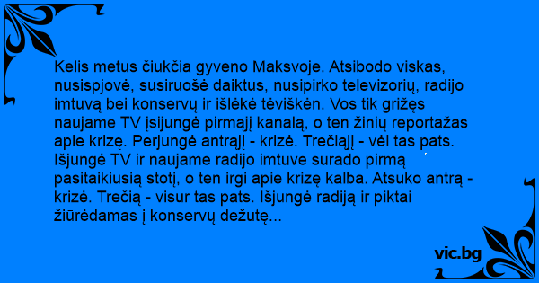Kelis metus čiukčia gyveno Maksvoje. Atsibodo viskas, nusispjovė, susiruošė daiktus, nusipirko televizorių, radijo imtuvą bei konservų ir išlėkė tėviškėn. Vos tik grižęs naujame TV įsijungė pirmąjį kanalą, o ten žinių reportažas apie krizę. Perjungė antrąjį - krizė. Trečiąjį - vėl tas pats. Išjungė TV ir naujame radijo imtuve surado pirmą pasitaikiusią stotį, o ten irgi apie krizę kalba. Atsuko antrą - krizė. Trečią - visur tas pats. Išjungė radiją ir piktai žiūrėdamas į konservų dežutę pagalvojo: