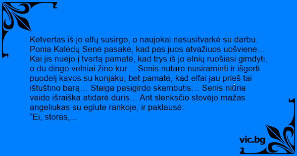 Ketvertas iš jo elfų susirgo, o naujokai nesusitvarkė su darbu. Ponia Kalėdų Senė pasakė, kad pas juos atvažiuos uošvienė… Kai jis nuėjo į tvartą pamatė, kad trys iš jo elnių ruošiasi gimdyti, o du dingo velniai žino kur… Senis nutarė nusiraminti ir išgerti puodelį kavos su konjaku, bet pamatė, kad elfai jau prieš tai ištuštino barą… Staiga pasigirdo skambutis… Senis niūria veido išraiška atidarė duris… Ant slenksčio stovėjo mažas angeliukas su eglute rankoje, ir paklausė: