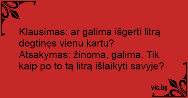 Klausimas: ar galima išgerti litrą degtinęs vienu kartu?<br />Atsakymas: žinoma, galima. Tik kaip po to tą litrą išlaikyti savyje?