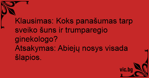 Klausimas: Koks panašumas tarp sveiko šuns ir trumparegio ginekologo? Atsakymas: Abiejų nosys visada šlapios.