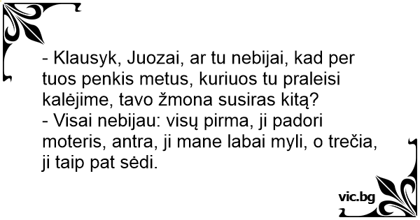 - Klausyk, Juozai, ar tu nebijai, kad per tuos penkis metus, kuriuos tu praleisi kalėjime, tavo žmona susiras kitą?