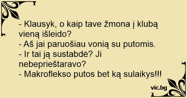 - Klausyk, o kaip tave žmona į klubą vieną išleido?