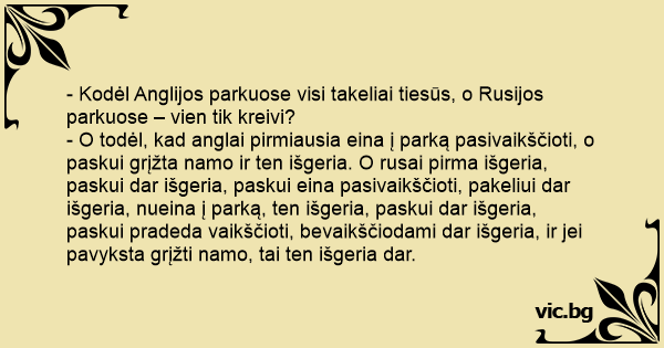 - O todėl, kad anglai pirmiausia eina į parką pasivaikščioti, o paskui grįžta namo ir ten išgeria. O rusai pirma išgeria, paskui dar išgeria, paskui eina pasivaikščioti, pakeliui dar išgeria, nueina į parką, ten išgeria, paskui dar išgeria, paskui pradeda vaikščioti, bevaikščiodami dar išgeria, ir jei pavyksta grįžti namo, tai ten išgeria dar.