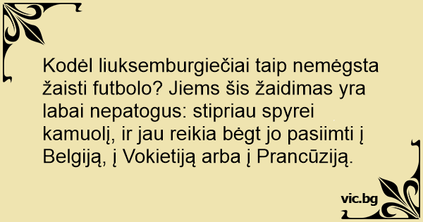 Kodėl liuksemburgiečiai taip nemėgsta žaisti futbolo? Jiems šis žaidimas yra labai nepatogus: stipriau spyrei kamuolį, ir jau reikia bėgt jo pasiimti į Belgiją, į Vokietiją arba į Prancūziją.