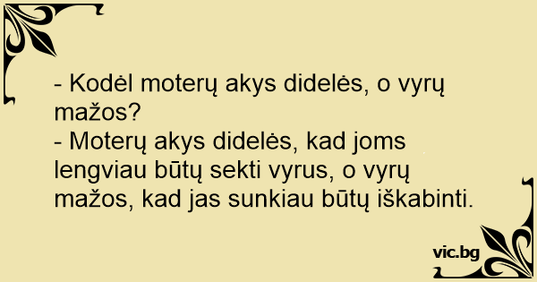 - Moterų akys didelės, kad joms lengviau būtų sekti vyrus, o vyrų mažos, kad jas sunkiau būtų iškabinti.