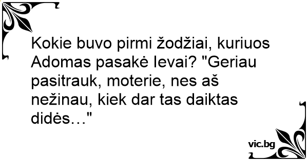 Kokie buvo pirmi žodžiai, kuriuos Adomas pasakė Ievai? "Geriau pasitrauk, moterie, nes aš nežinau, kiek dar tas daiktas didės…"