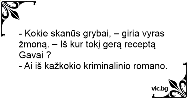 - Kokie skanūs grybai, – giria vyras žmoną. – Iš kur tokį gerą receptą
