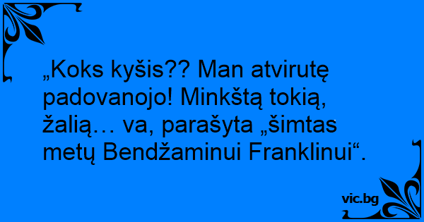 „Koks kyšis?? Man atvirutę padovanojo! Minkštą tokią, žalią… va, parašyta „šimtas metų Bendžaminui Franklinui“.
