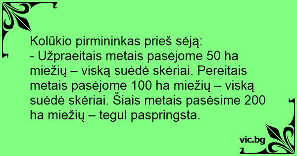 - Užpraeitais metais pasėjome 50 ha miežių – viską suėdė skėriai. Pereitais metais pasėjome 100 ha miežių – viską suėdė skėriai. Šiais metais pasėsime 200 ha miežių – tegul paspringsta.