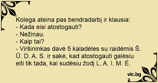 - Viršininkas davė 5 kaladėles su raidėmis Š. Ū. D. A. S. ir sakė, kad atostogauti galėsiu eiti tik tada, kai sudėsiu žodį L. A. I. M. Ė.