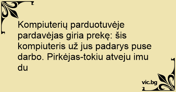 Kompiuterių parduotuvėje pardavėjas giria prekę: šis kompiuteris už jus padarys puse darbo. Pirkėjas-tokiu atveju imu du