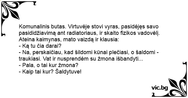 Komunalinis butas. Virtuvėje stovi vyras, pasidėjęs savo pasididžiavimą ant radiatoriaus, ir skaito fizikos vadovėlį. Ateina kaimynas, mato vaizdą ir klausia: