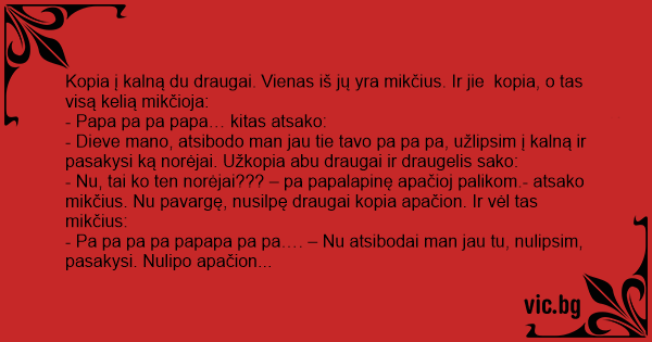 Kopia į kalną du draugai. Vienas iš jų yra mikčius. Ir jie kopia, o tas visą kelią mikčioja: