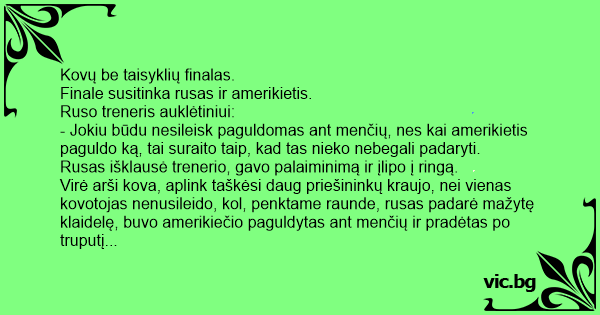 Na, tokį vaizdą pamatęs ruso treneris, aišku iš karto prarado bet kokias viltis, spjovė ant grindų ir nuėjo į persirengimo kambarį, įsipylė vieną šimtą, antrą, jau gers trečią, bet girdi – Rusijos himnas groja.