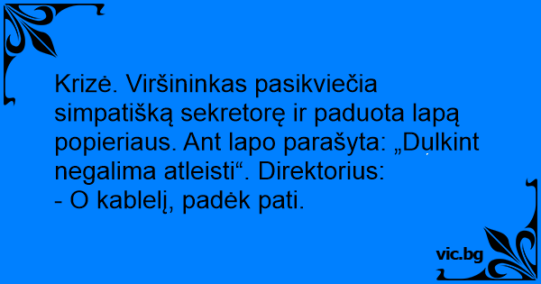 Krizė. Viršininkas pasikviečia simpatišką sekretorę ir paduota lapą popieriaus. Ant lapo parašyta: „Dulkint negalima atleisti“. Direktorius: