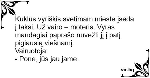 Kuklus vyriškis svetimam mieste įsėda į taksi. Už vairo – moteris. Vyras mandagiai paprašo nuvežti jį į patį pigiausią viešnamį.