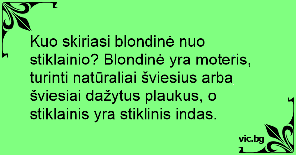 Kuo skiriasi blondinė nuo stiklainio? Blondinė yra moteris, turinti natūraliai šviesius arba šviesiai dažytus plaukus, o stiklainis yra stiklinis indas.