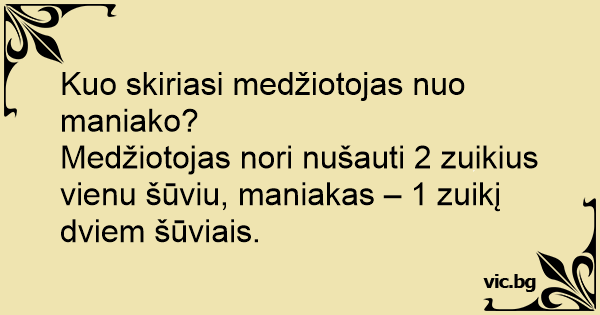 Medžiotojas nori nušauti 2 zuikius vienu šūviu, maniakas – 1 zuikį dviem šūviais.